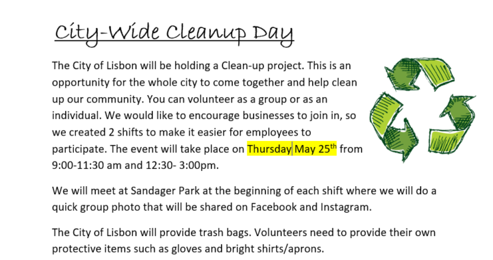 City Clean-up Day Calendar Add to Calendar Add to Timely Calendar Add to Google Add to Outlook Add to Apple Calendar Add to other calendar Export to XML When: May 25, 2023 @ 9:00 am – 3:00 pm 2023-05-25T09:00:00-05:00 2023-05-25T15:00:00-05:00 Where: Sandager Park, City of Lisbon Contact: Janna Miller 17016834140 Email Posted in .