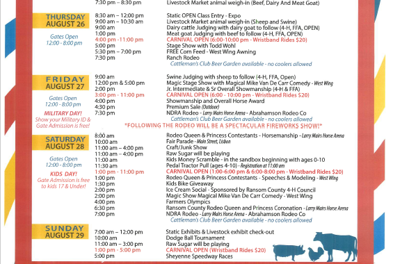 Ransom County Fair Calendar Add to Calendar Add to Timely Calendar Add to Google Add to Outlook Add to Apple Calendar Add to other calendar Export to XML When: August 25, 2021 – August 31, 2021 all-day 2021-08-25T00:00:00-05:00 2021-09-01T00:00:00-05:00 Where: Ransom County Fair Grounds Fair Schedule (ransomcountyfair.com) Posted in .
